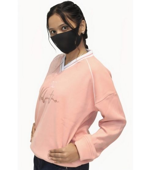 This is a peach-colored women's V-neck sweatshirt with white outline trim. The sweatshirt features an attractive, fine-script "Valentina" graphic print near the chest, giving it a casual look. It is designed for a comfortable fit with long sleeves.
