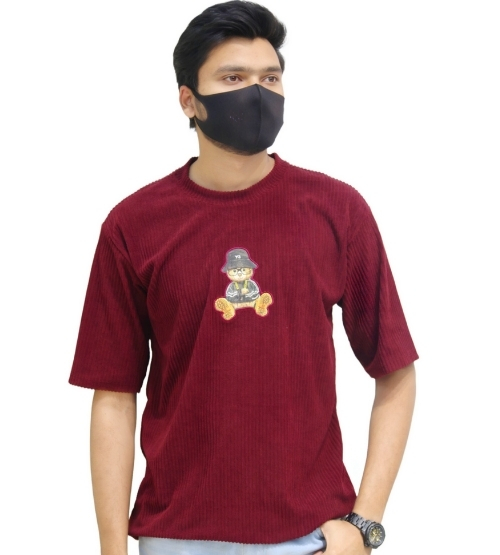 This is a maroon colored men's T-shirt with a small, cartoon graphic print on the front chest.
